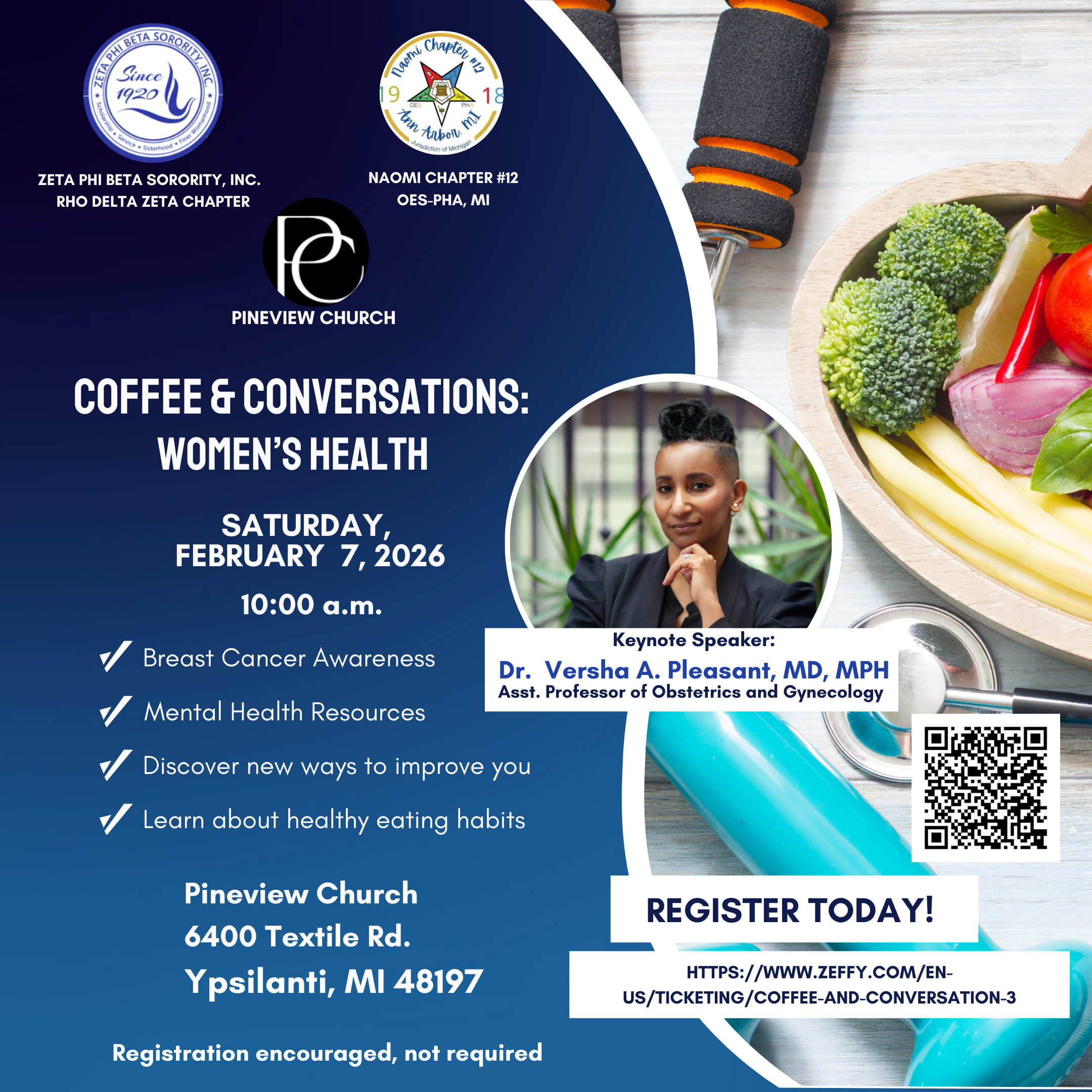 Join Zeta Phi Beta Sorority, Inc. Rho Delta Zeta Chapter and Naomi Chapter #12, OES PHA, MI for “Coffee and Conversations” regarding Women’s Health. Our keynote speaker, Dr. Versha A. Pleasant, MD MPH, will share information on breast/ovarian cancer awareness. This FREE event “Coffee and Conversations” will be held on Saturday, February 7, 2026 at […]
